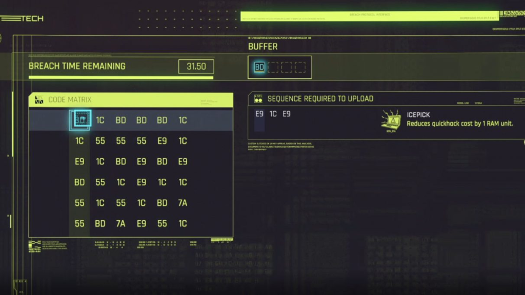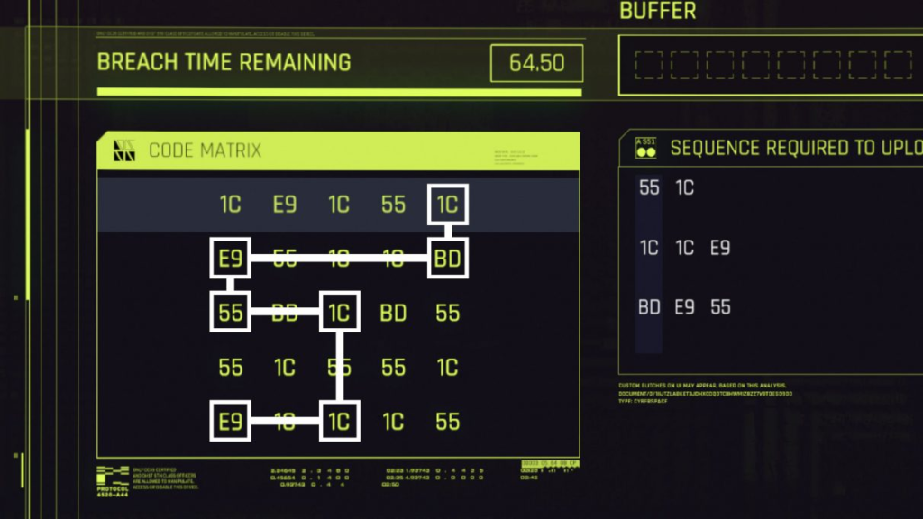 Your aim with this minigame is to use the grid on the left to complete the sequence (or sequences) on the right. There are four parts to look at every time you enter the Breach Protocol hacking minigame: