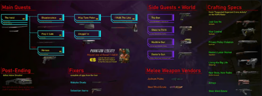 Fandom: Category:Cyberpunk 2077 Clothing | Category:Cyberpunk 2077 Weapons | Category:Cyberpunk 2077 Consumables VULKK: Cyberpunk 2077 Legendary and Iconic Sets | Cyberpunk 2077 Iconic Weapons List and Locations (Base Game)